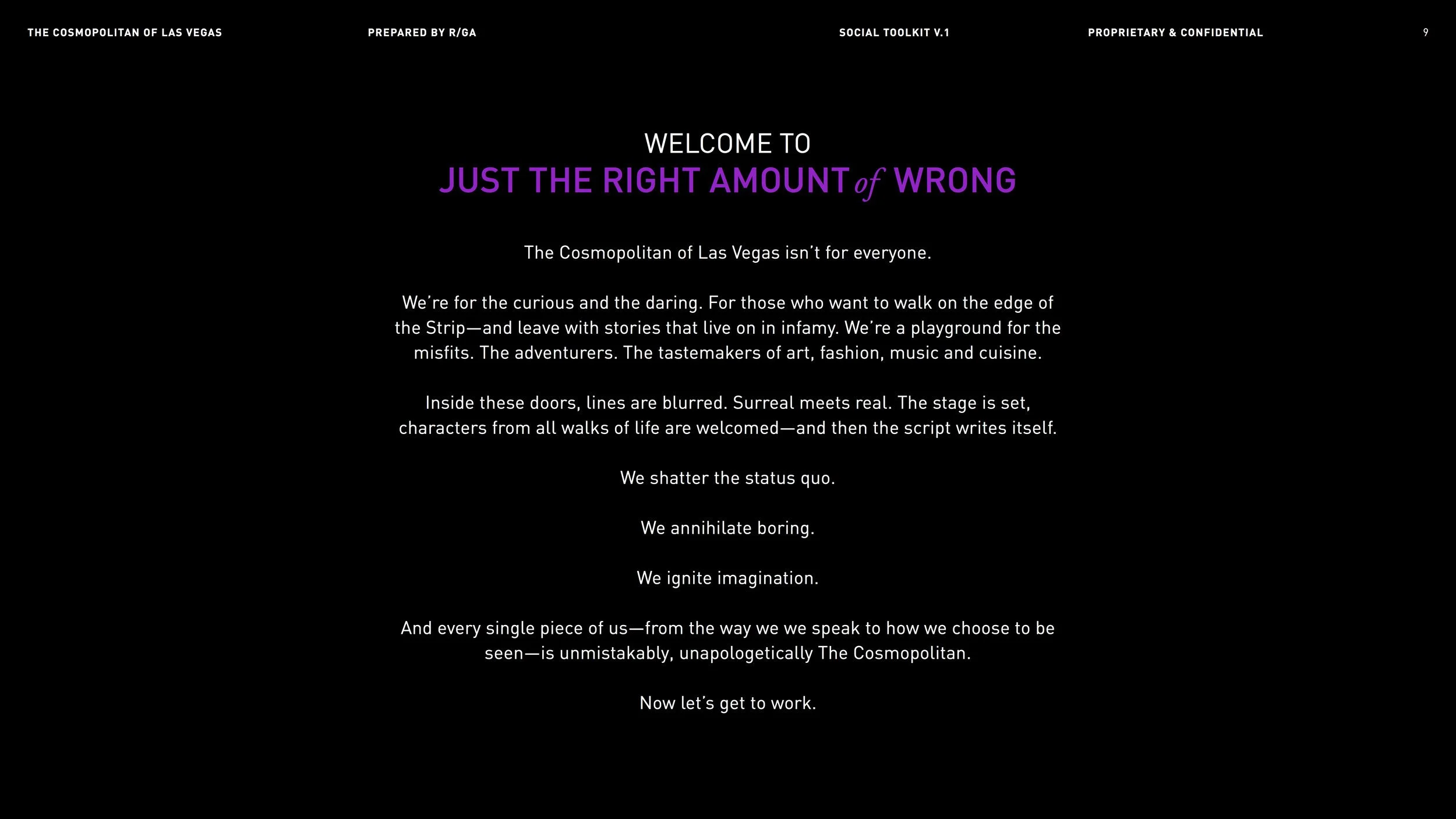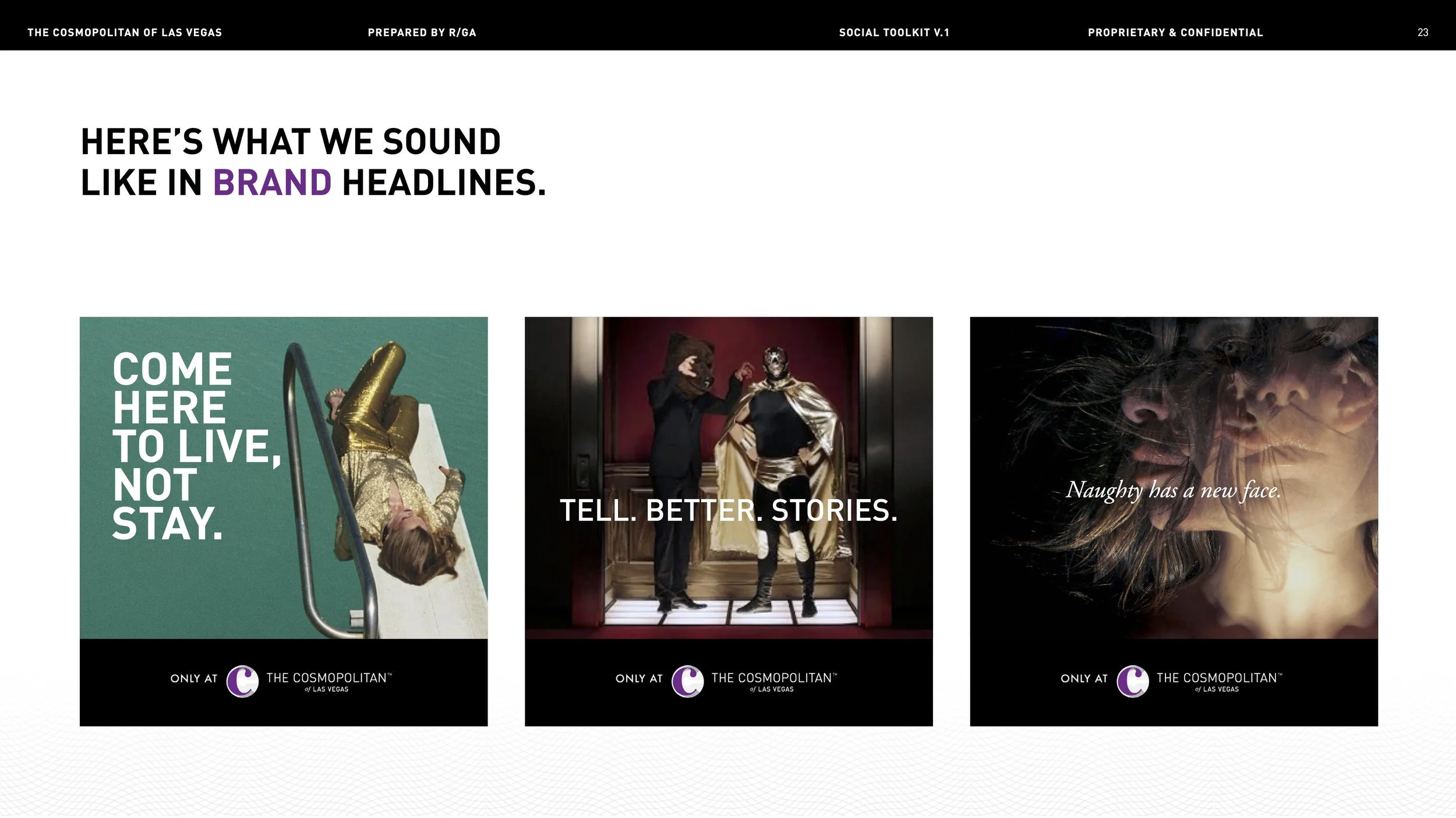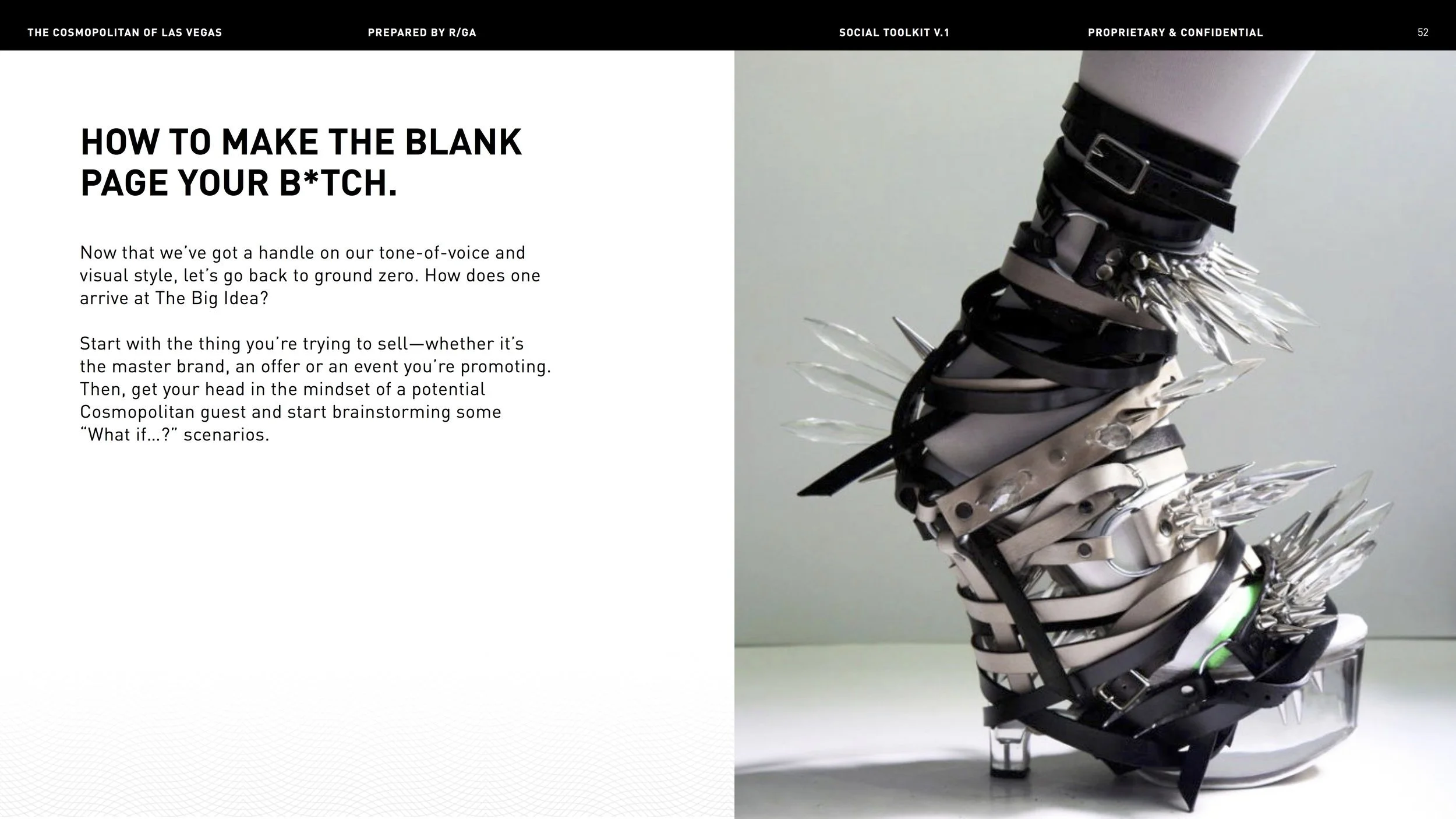 Once in a creative’s wildest dreams, there comes a brand so fun, so fierce — they let you do stuff like show two naked men in an ad and write “How to Make the Blank Page Your B*tch” in their marketing style guide. Enter the Cosmopolitan Hotel of Las Vegas, home of Just the Right Amount of Wrong. Here’s a smattering of my faves, created by Yours Truly and my team at R/GA.