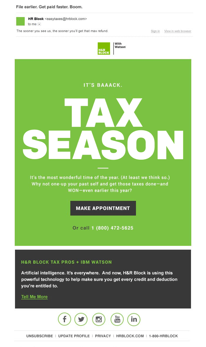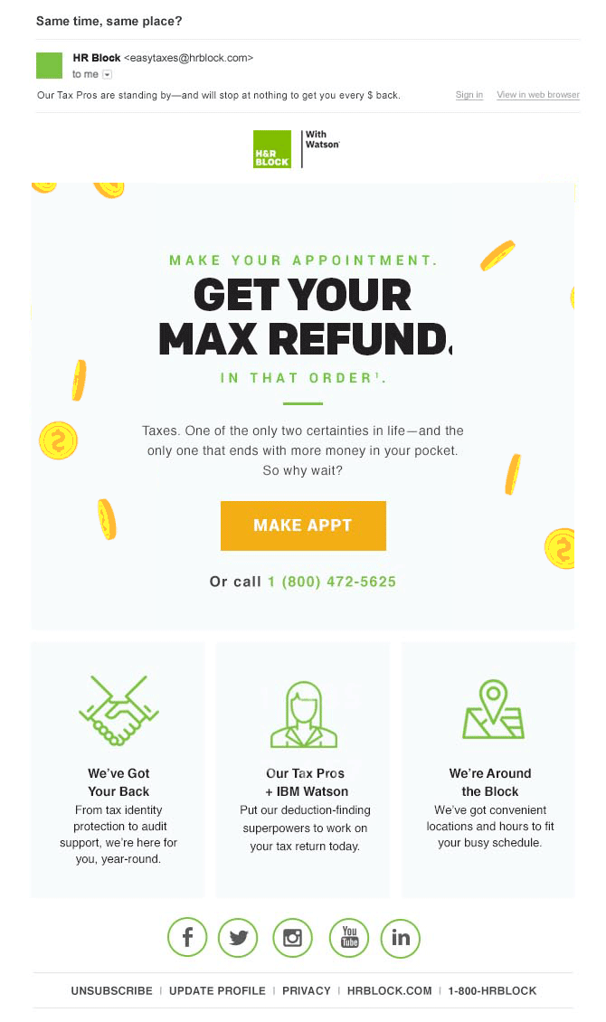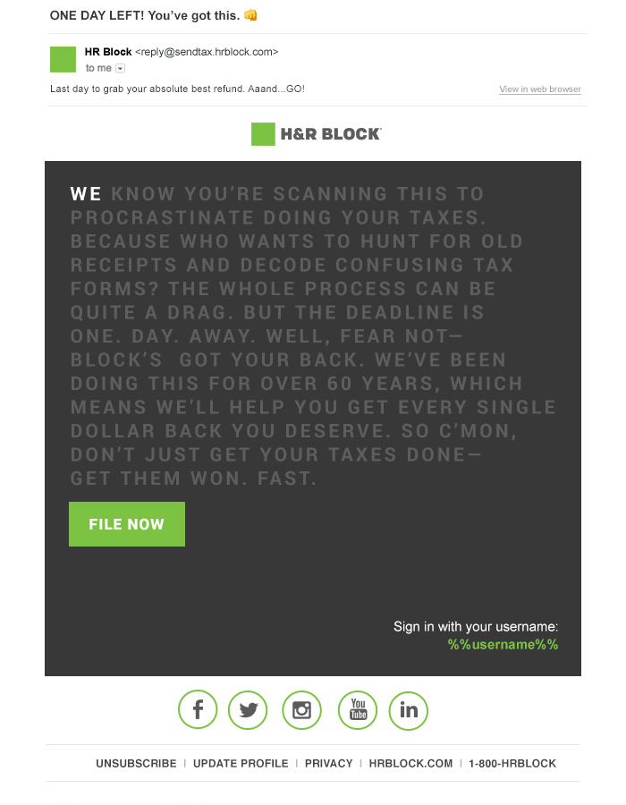 There’s a reason ol’ Benny put taxes in the same category as death. Over four grueling-yet-enlightening tax seasons, my knowledge of eCRM best practices grew to expert level, along with learning to write insane amounts of direct response for multiple audience segments — all while managing the frenetic pace that is tax season advertising.