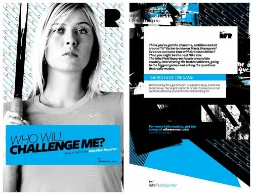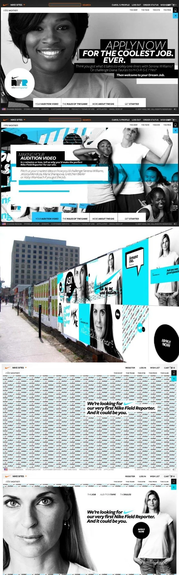 Imagine one lucky, sports-loving gal getting to volley one-liners with Serena Williams. Or challenge Michelle Wie to a game of Nintendo Wii. Enter the Nike Field Reporter, an online program birthed by me and my team at R/GA. With a little help from icons in women’s sports, we invited Nike Women fans to apply for the “Coolest. Job. Ever.” — a roving correspondent who jetsetted cross-country, interviewing and training with elite athletes the likes of Serena and LeBron. Our little Nike Field Reporter feature was so successful, it ended up running for five years. (Fun fact: a couple of our Nike Field Reporters even went on to land jobs at ESPN.)