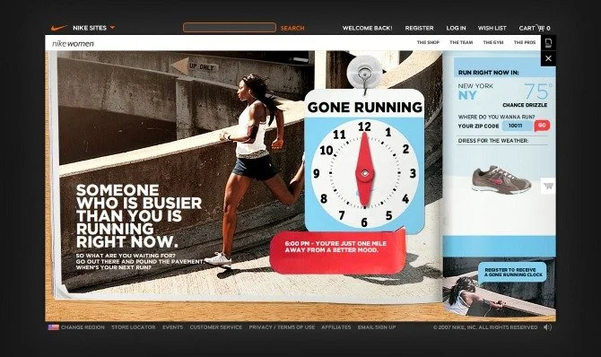 Gone Running served as a not-so-gentle reminder: time spent thinking about running is time spent not running. And if that wasn’t reason enough? This interactive clock gave you 96 more reasons to “Just Do It” — one for every 15 minutes in a 24-hour day. The site also served up the current weather conditions and relevant product suggestions for your next run. No excuses now!